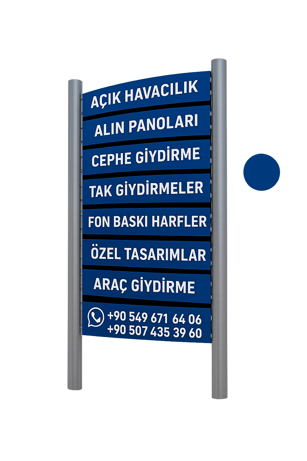 Işıklı tabela, ışıklı/ışıksız kutu harfler, pleksi ve krom harfler, totem tabelalar, cephe giydirme, yönlendirme tabelaları ve araç giydirme gibi geniş bir yelpazede hizmet veriyoruz.